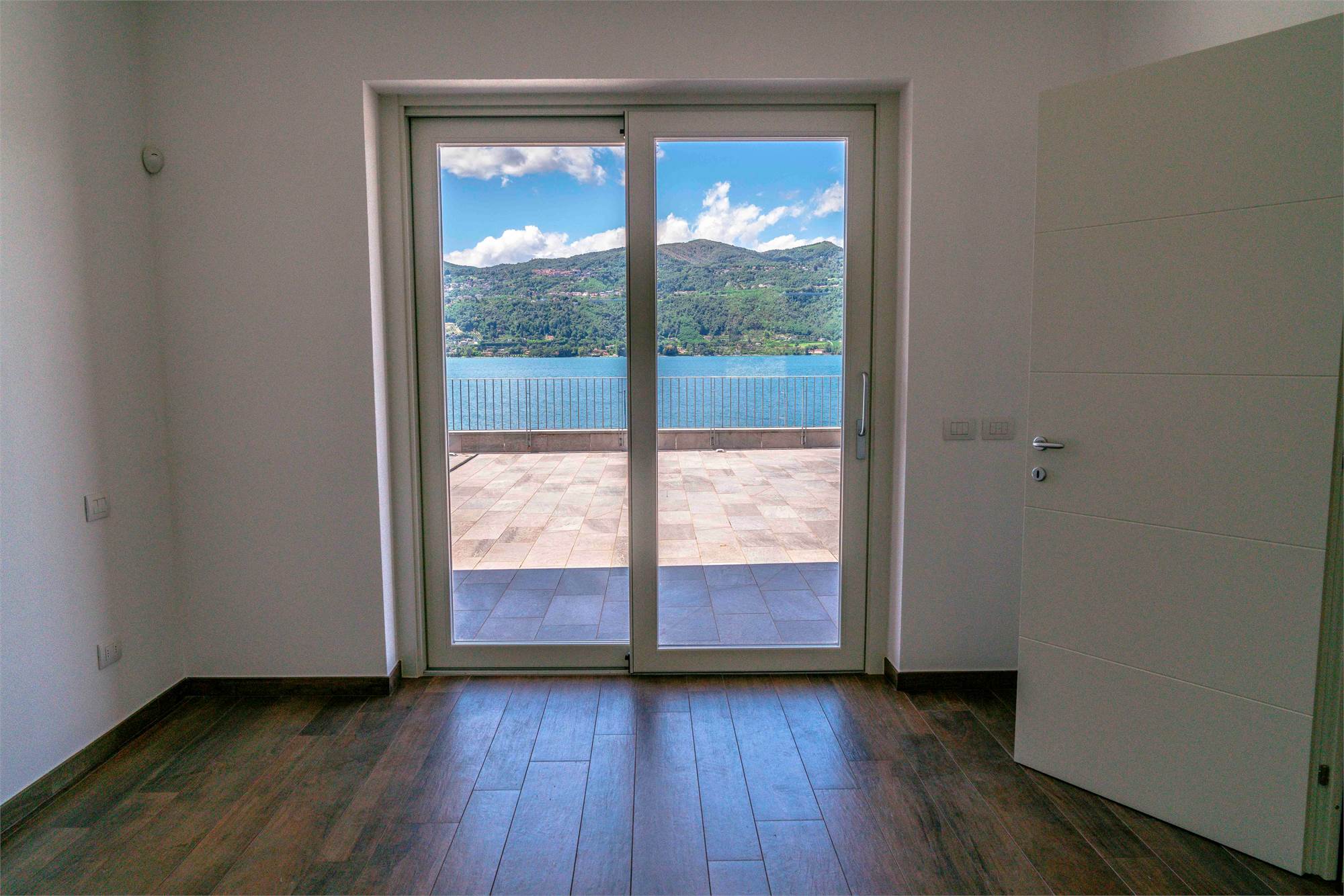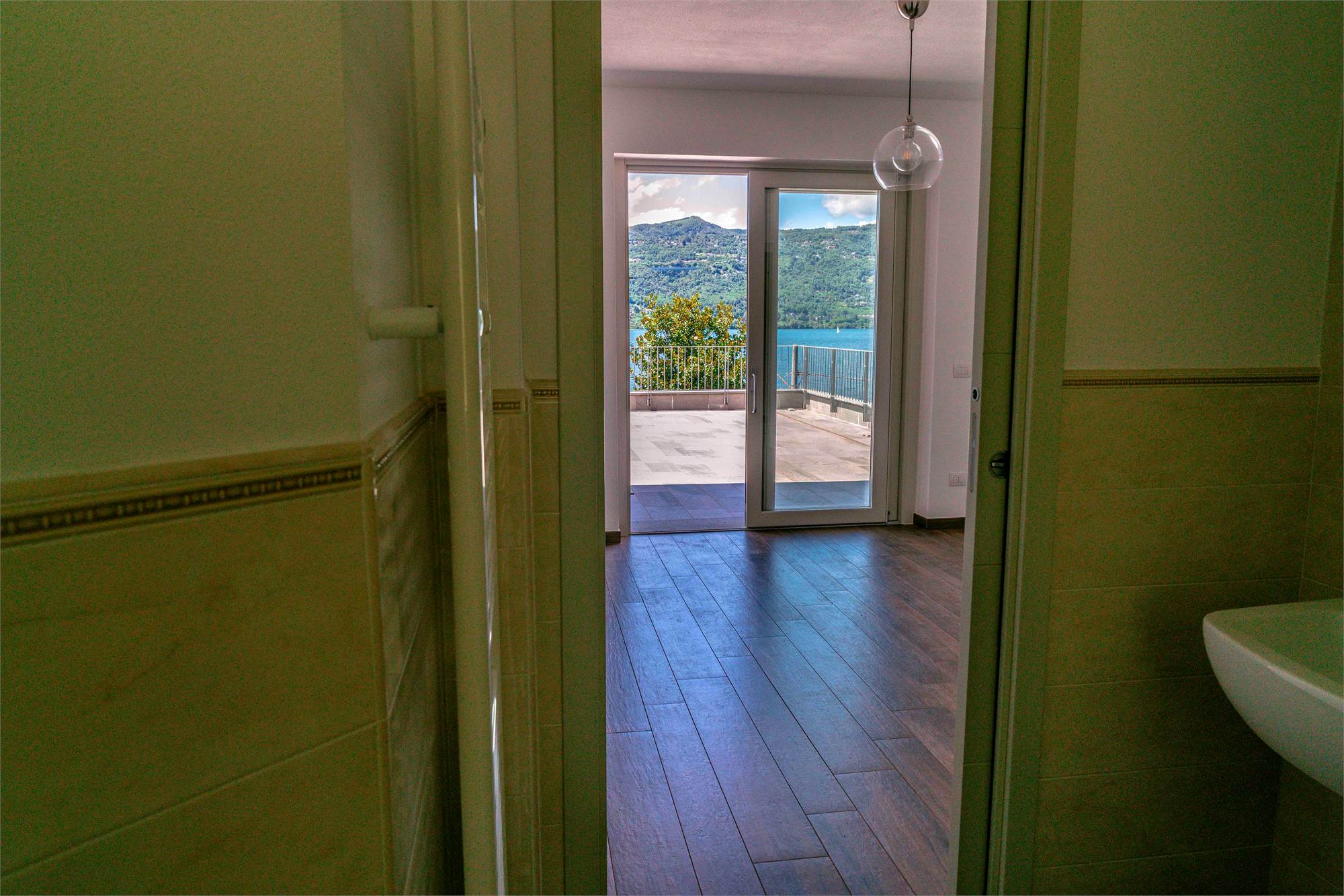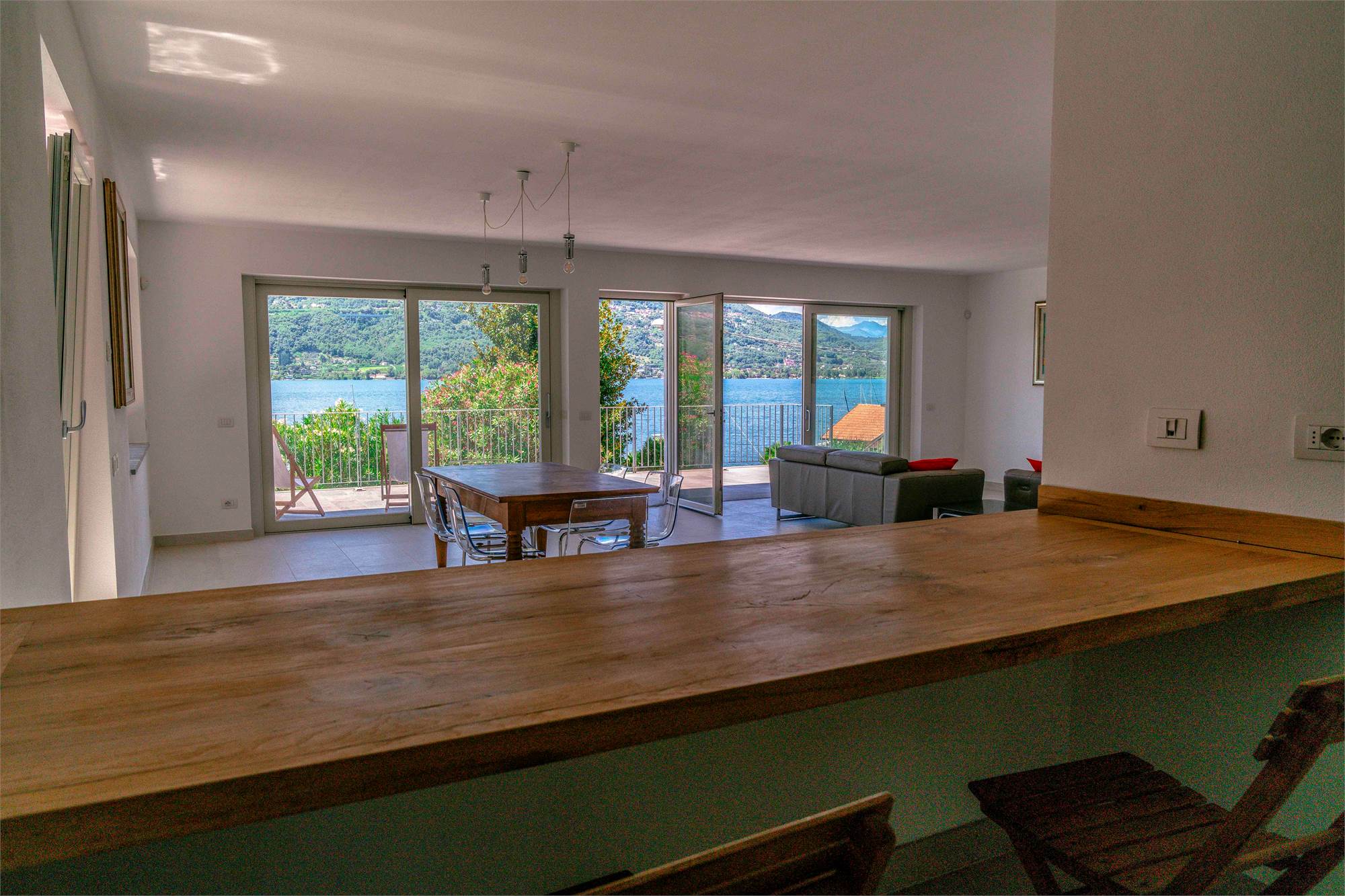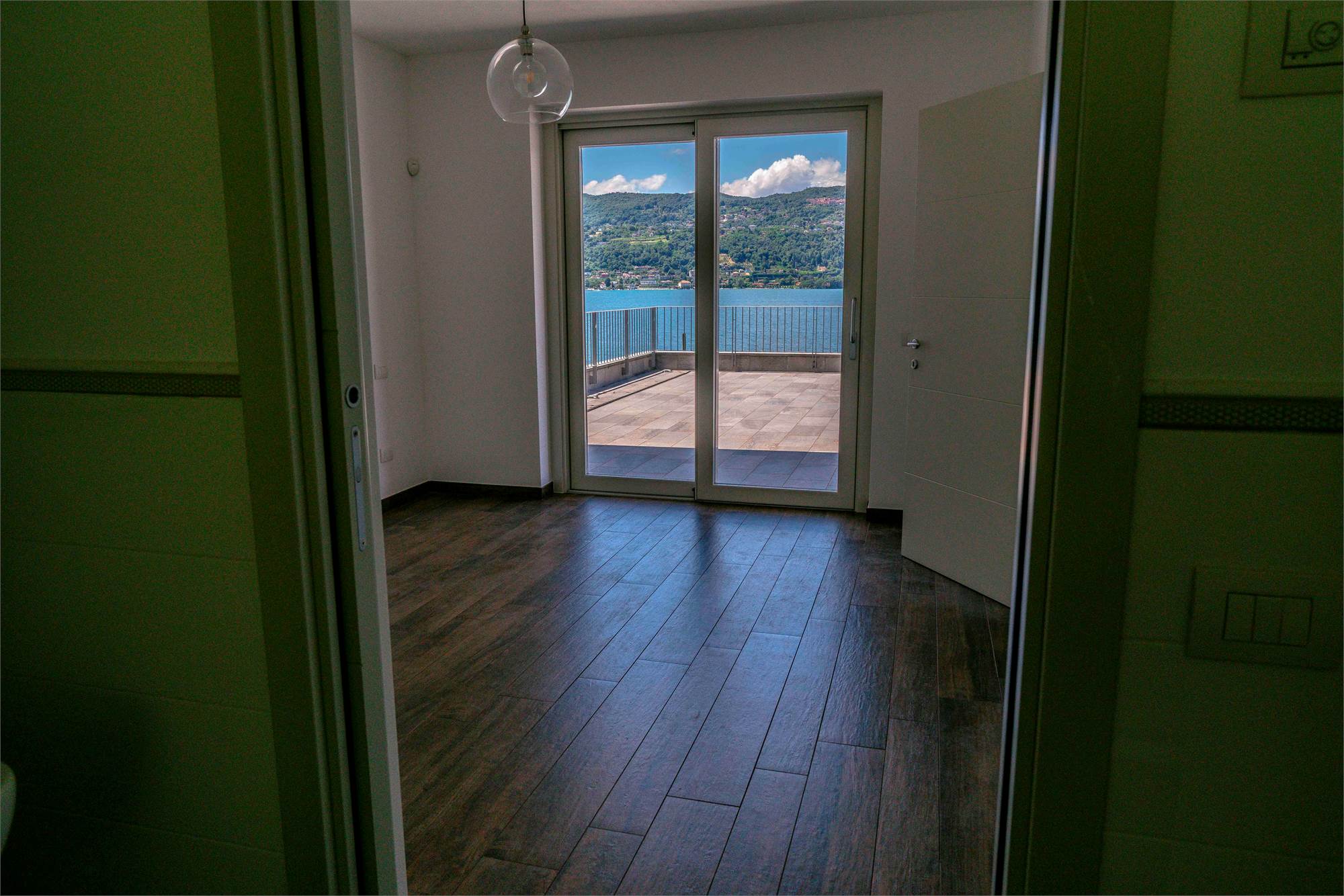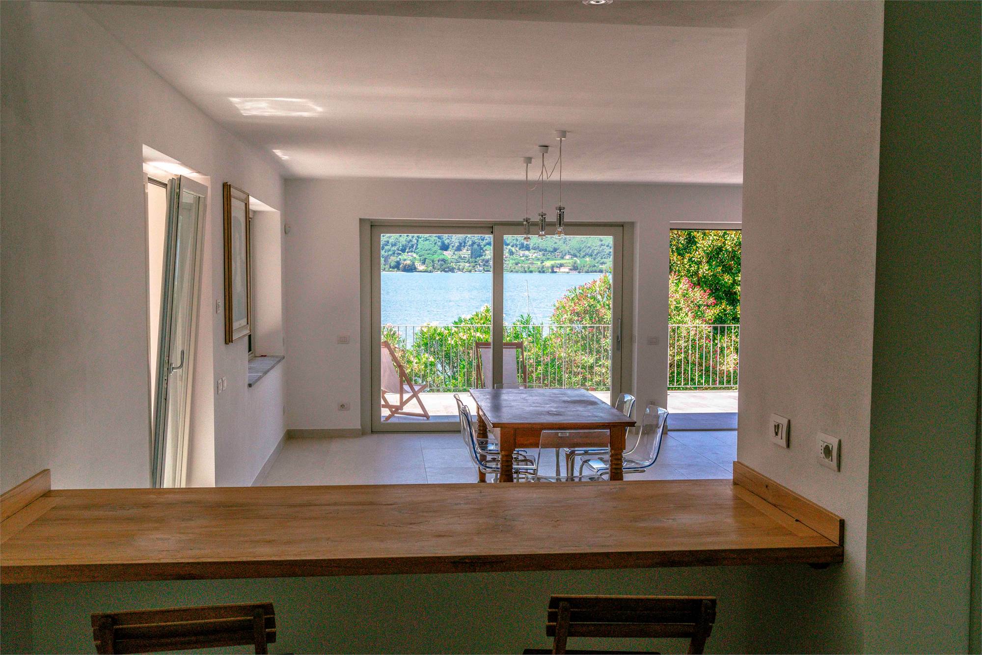 Piano terra - terrazzo di circa 40 mq, ampio soggiorno/ cucina con grandi vetrate vista lago, dispensa, due grandi ripostigli e bagno;