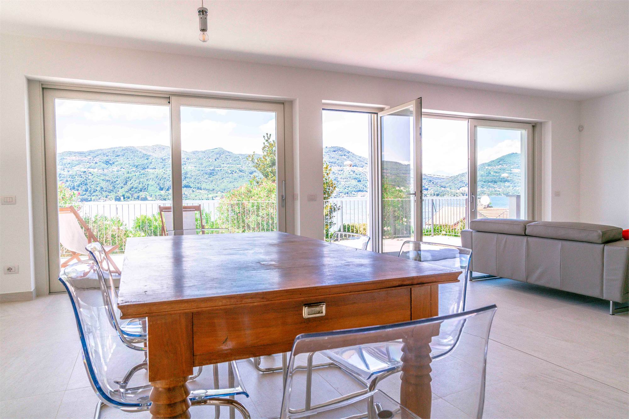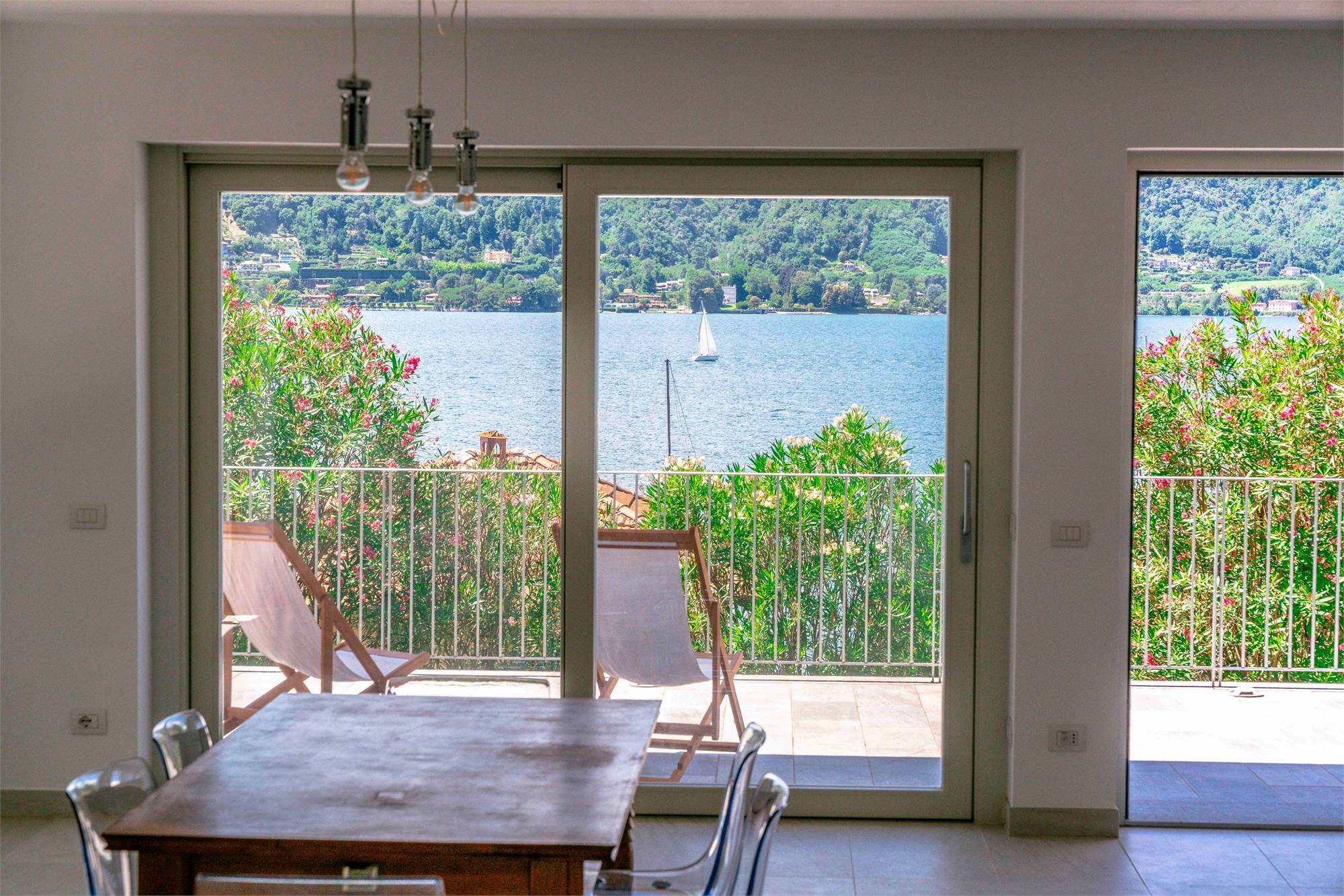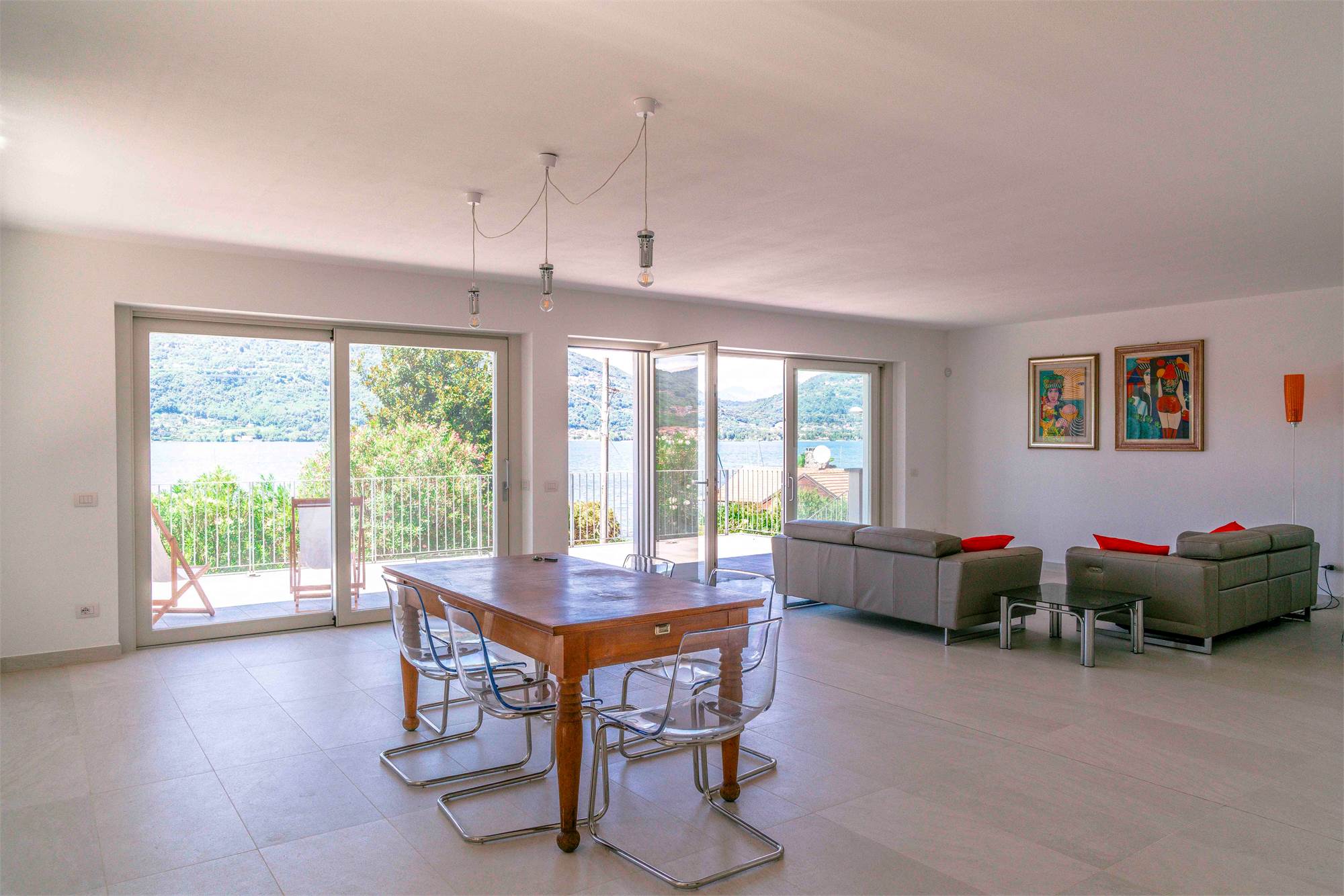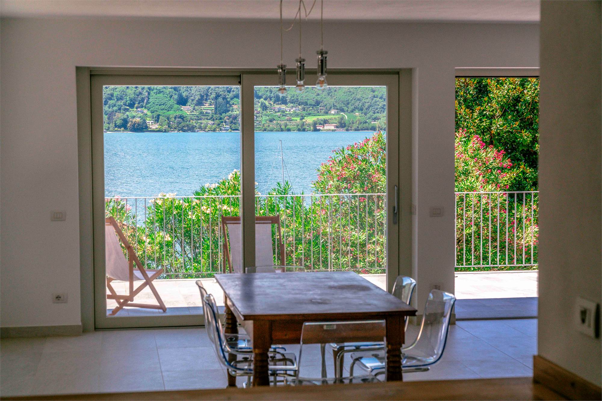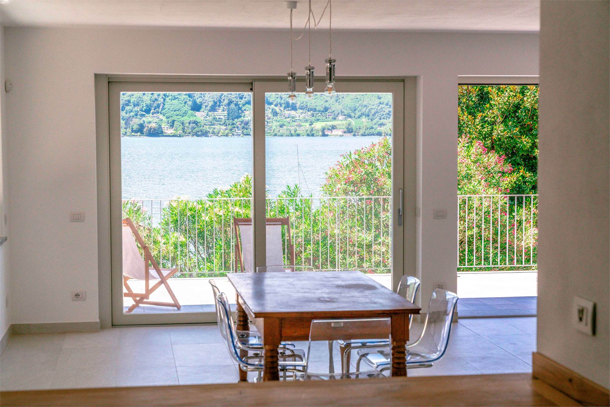 Piano terra - terrazzo di circa 40 mq, ampio soggiorno/ cucina con grandi vetrate vista lago, dispensa, due grandi ripostigli e bagno;