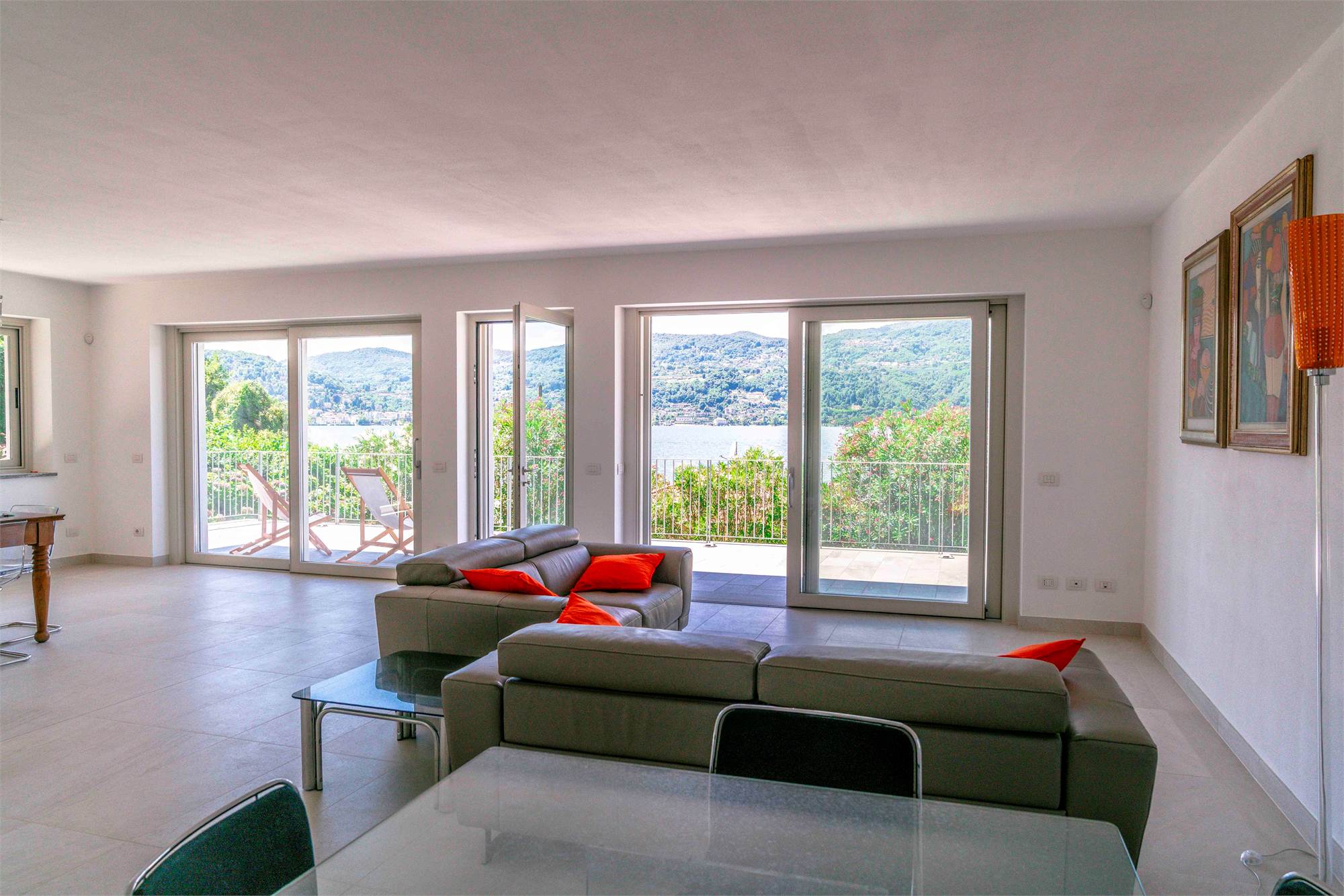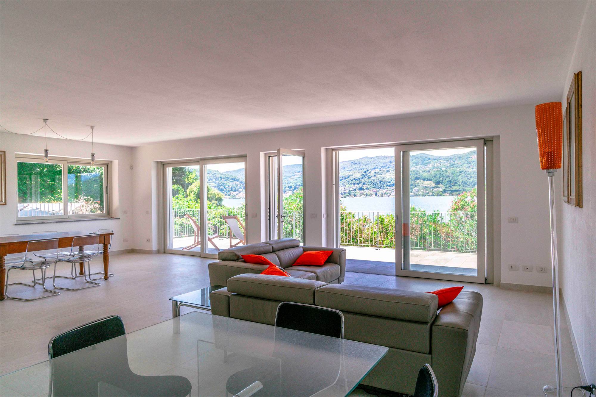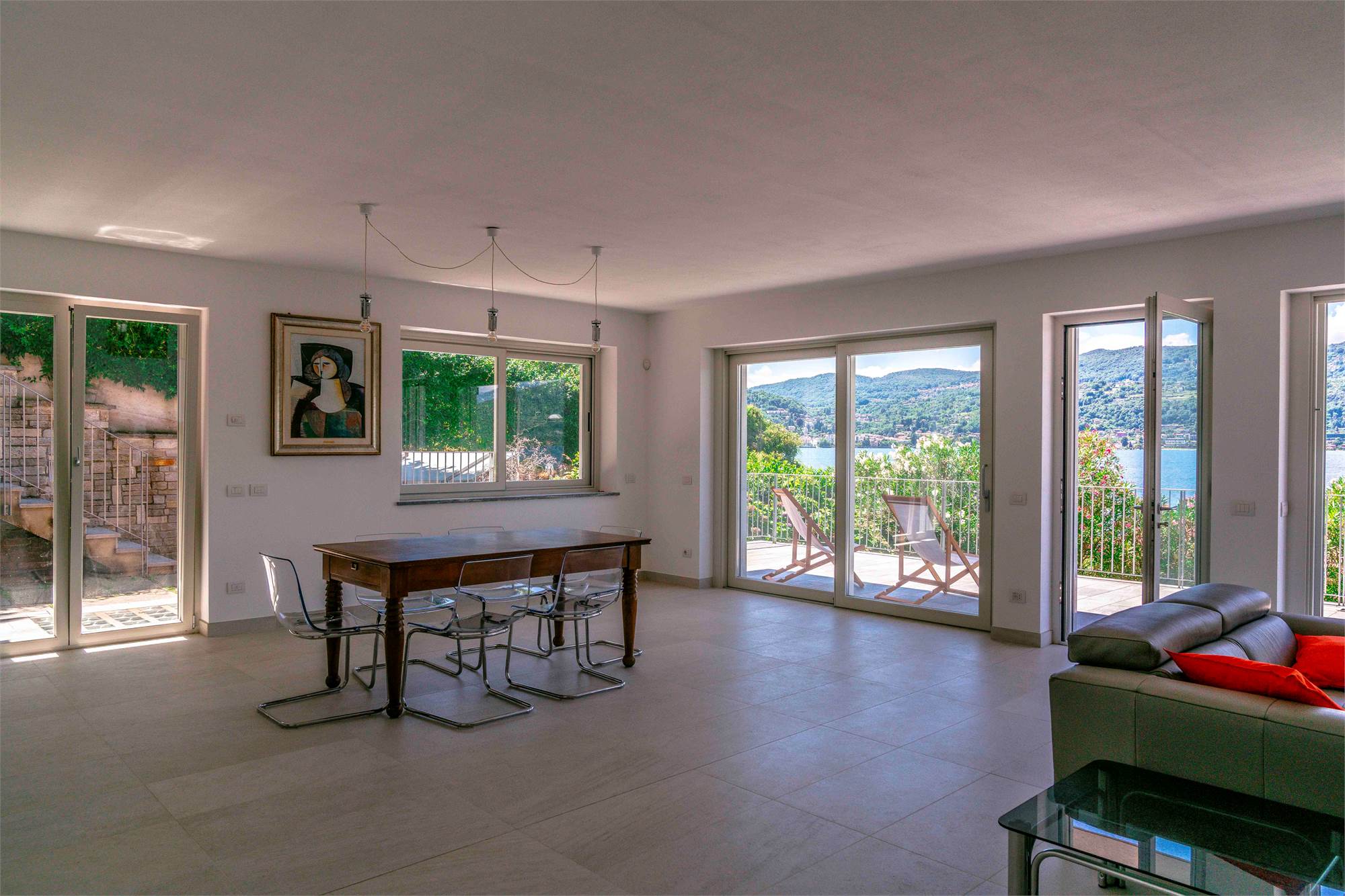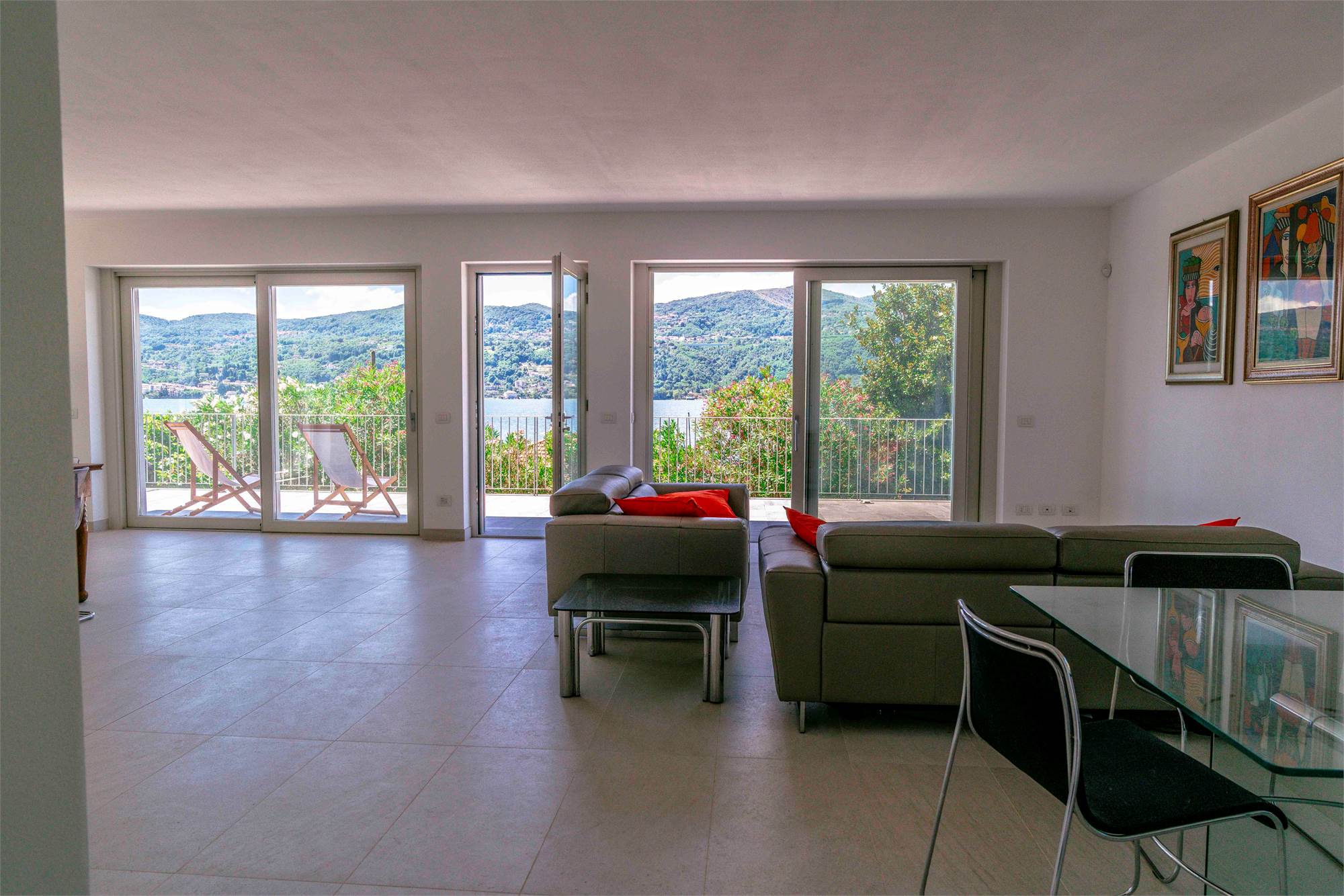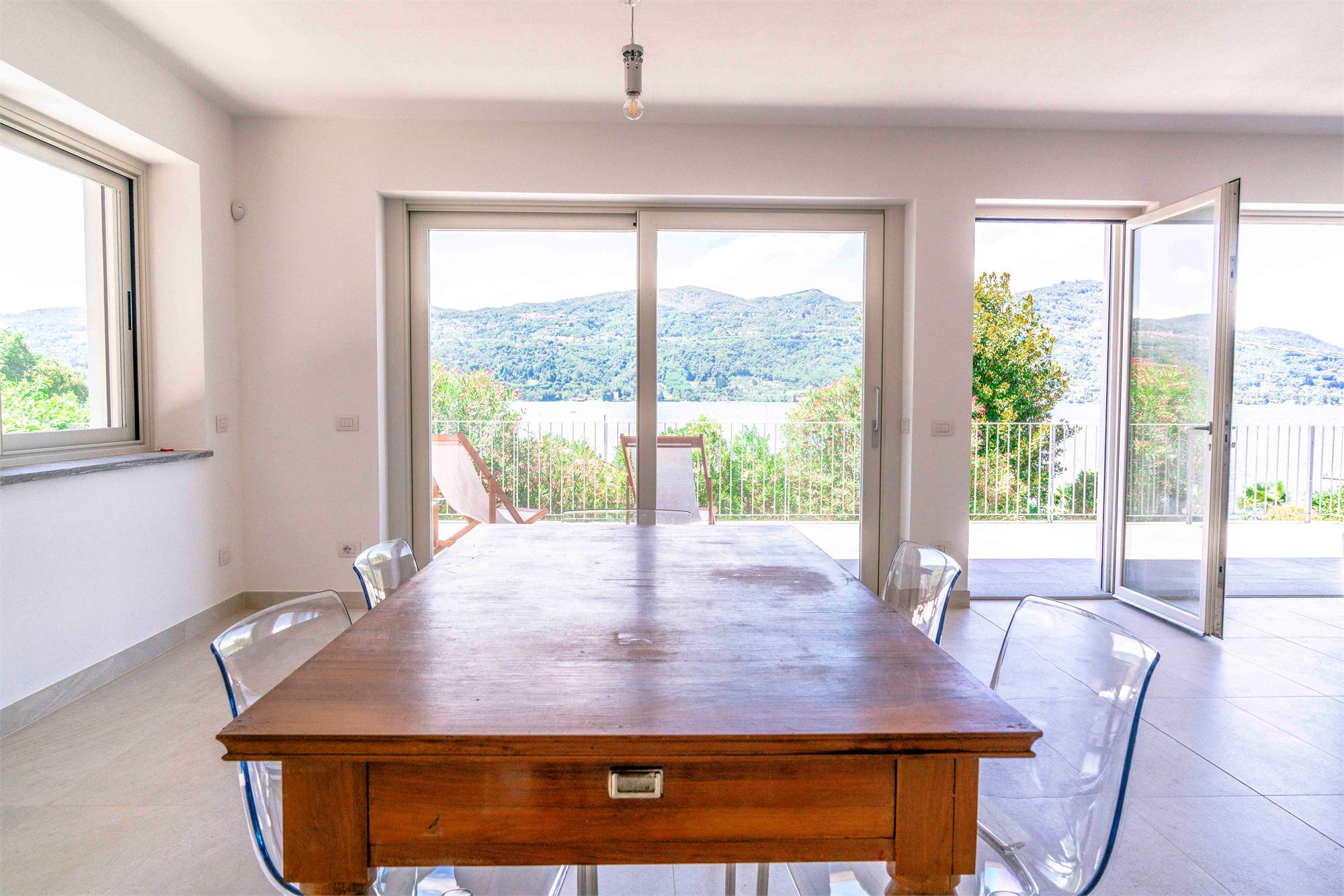 Piano terra - terrazzo di circa 40 mq, ampio soggiorno/ cucina con grandi vetrate vista lago, dispensa, due grandi ripostigli e bagno;