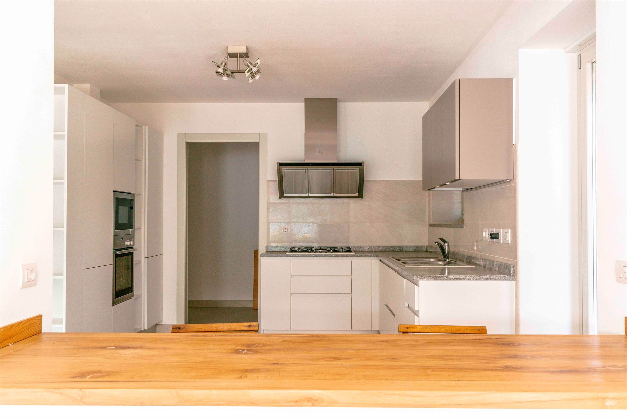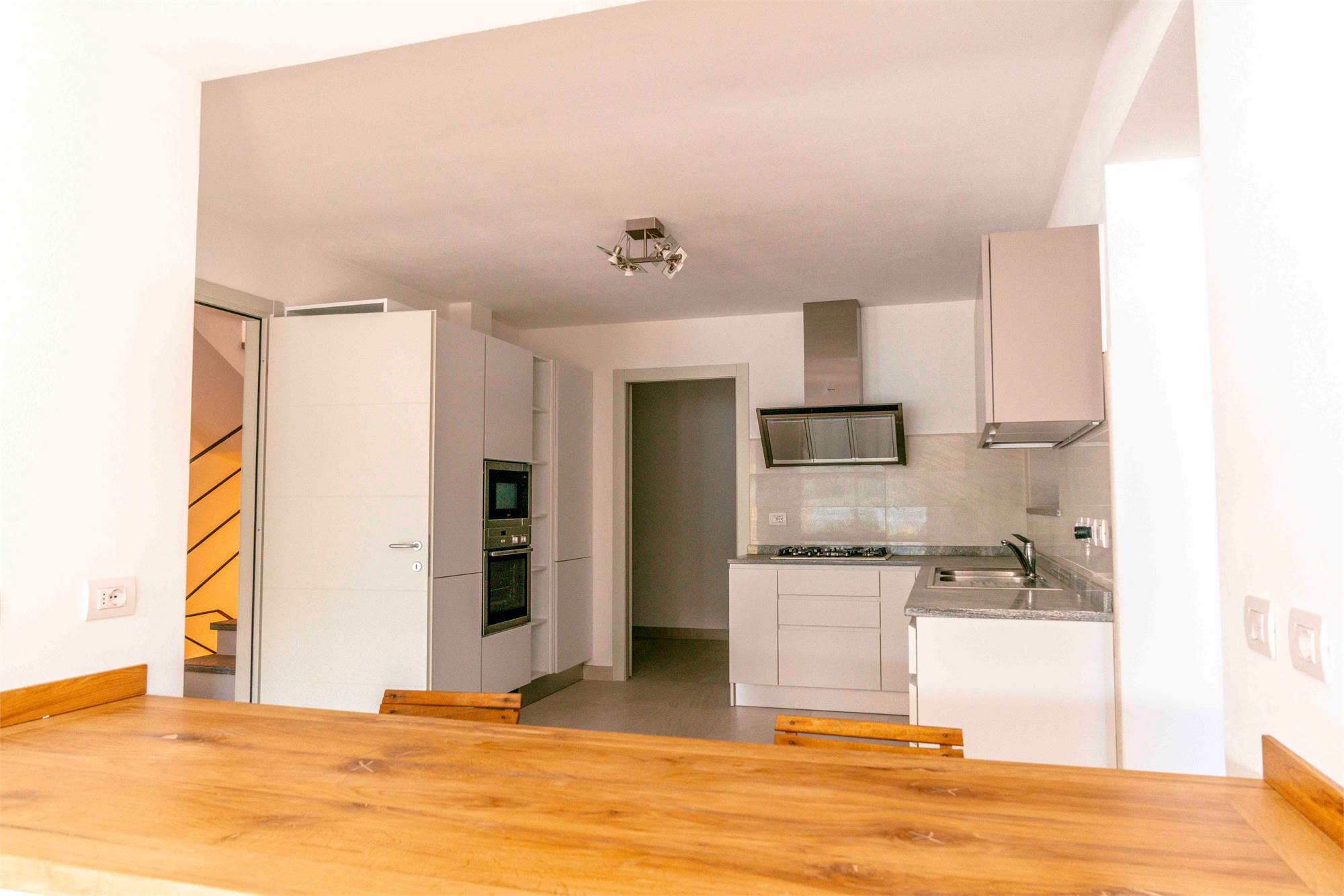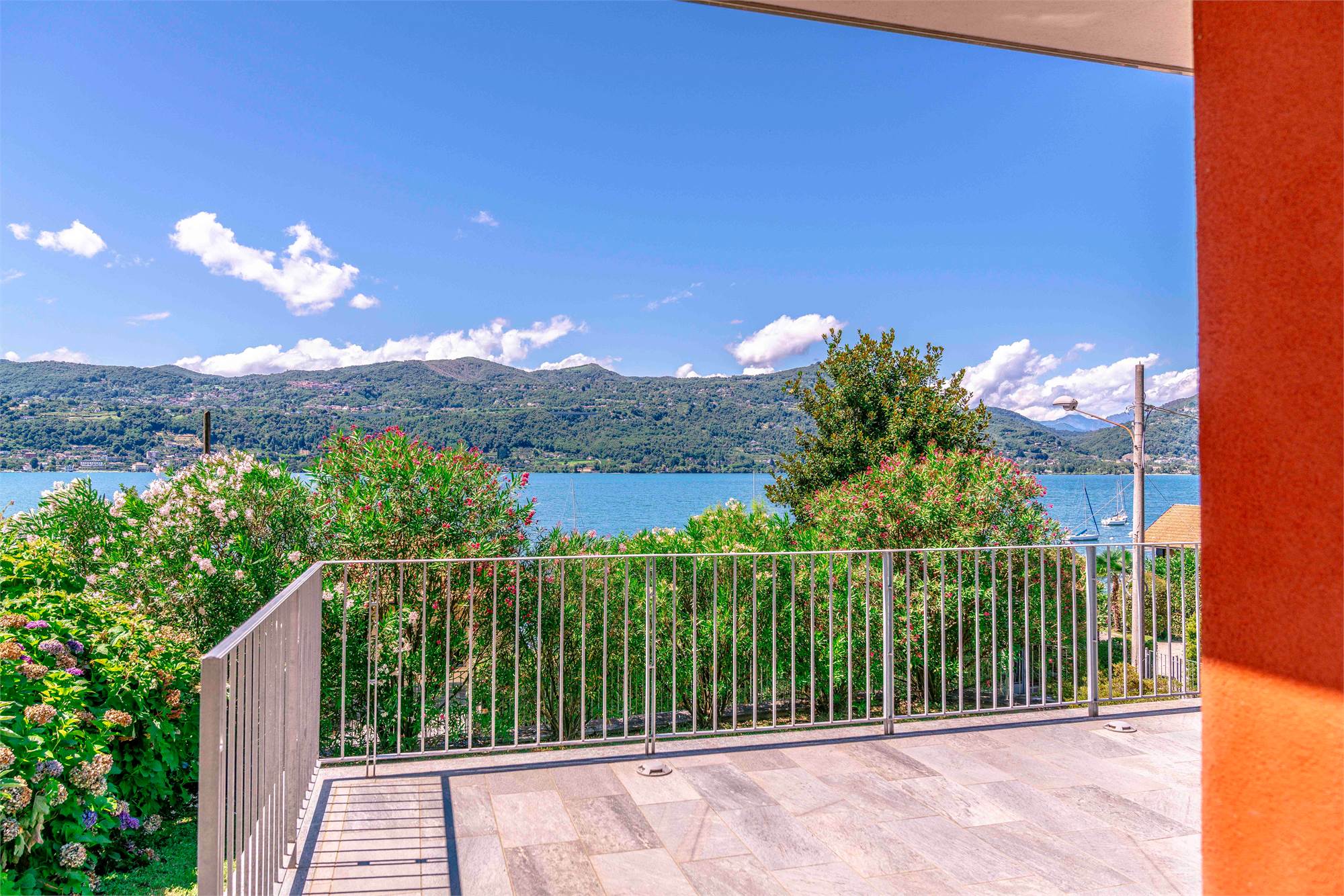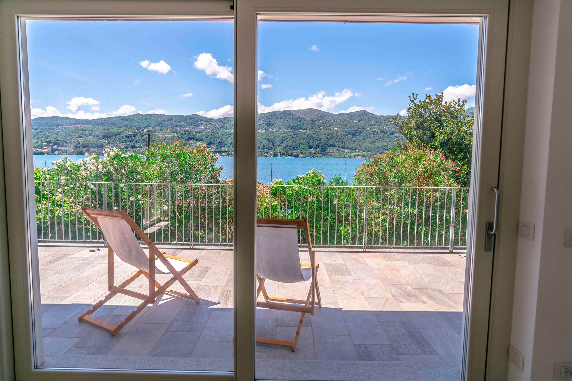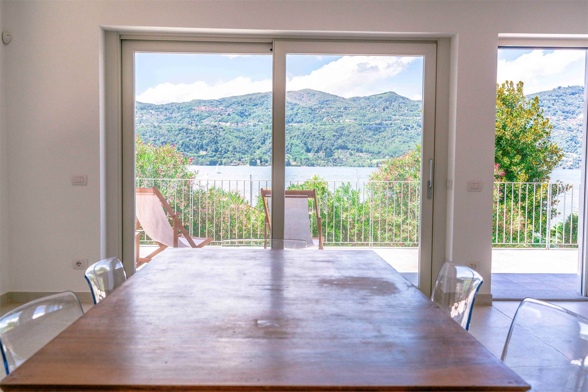 Piano terra - terrazzo di circa 40 mq, ampio soggiorno/ cucina con grandi vetrate vista lago, dispensa, due grandi ripostigli e bagno;
